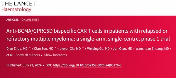 7月23日,采用(yòng)上海雅科(kē)生物(wù)科(kē)技(jì )有(yǒu)限公(gōng)司研发的BCMA/GPRC5D双特异CAR-T细胞治疗技(jì )术 (YK-BCMA-GPRC5D BoomTM, YK-CAR-069),由徐州医(yī)科(kē)大學(xué)血液病研究所医(yī)疗团队进行I期临床试验的研究成果在國(guó)际知名(míng)期刊发表:Anti-BCMA/GPRC5D bispecific CAR T cells in patients with relapsed or refractory multiple myeloma: a single-arm, phase 1 trial, The Lancet Haematology (Impact factor: 15.4)。徐州医(yī)科(kē)大學(xué)血液病研究所徐开林教授、李振宇教授,复旦大學(xué)生命科(kē)學(xué)學(xué)院兼职教授/上海雅科(kē)生物(wù)科(kē)技(jì )有(yǒu)限公(gōng)司CEO张鸿声教授為(wèi)本文(wén)共同通讯作(zuò)者,徐州医(yī)科(kē)大學(xué)血液病研究所的周典博士、孙乾博士和夏洁云博士為(wèi)文(wén)章的共同一作(zuò)。