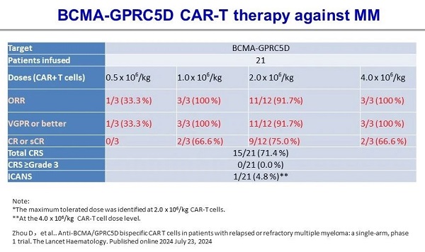 同时,本次临床试验也证明了BCMA/GPRC5D 双特异CAR-T细胞治疗的安(ān)全性。在21例患者中(zhōng),细胞因子释放综合征(CRS)发生率為(wèi)71%,且均為(wèi)1级或2级CRS;仅1例回输剂量為(wèi)最大耐受剂量4 x 106/kg的患者发生1级ICANS,回输剂量在最大耐受剂量以下的患者中(zhōng),均未观察到ICANS或3级以上细胞毒性。