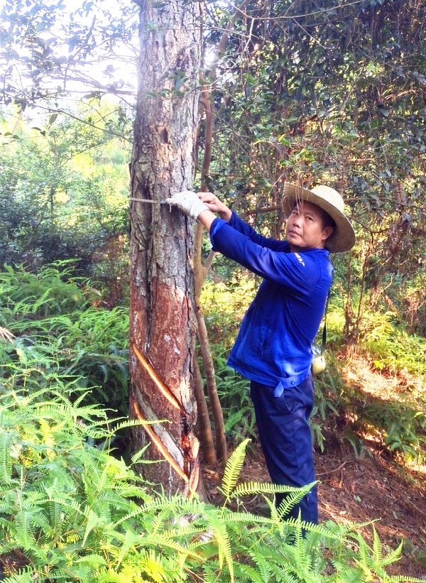 每年夏季是松树高产(chǎn)脂旺季,每年的采脂开刀(dāo)从“立夏”开始,跨越整个夏季。每个采脂工(gōng)人每年采割林木(mù)数量约6000株,每棵松树的采割刀(dāo)数要达到35刀(dāo)及以上。每个采脂工(gōng)人每天采割林木(mù)数量约2000株,有(yǒu)人曾计算过,采脂工(gōng)人每天在林地中(zhōng)步行数量不少于40000步,也就是不少于20000米,这每天步行20000多(duō)米啊,可(kě)不是在林荫小(xiǎo)道悠闲地散步,不是在花(huā)前月下享受着浪漫,而是头顶烈日,脚踏荆棘。